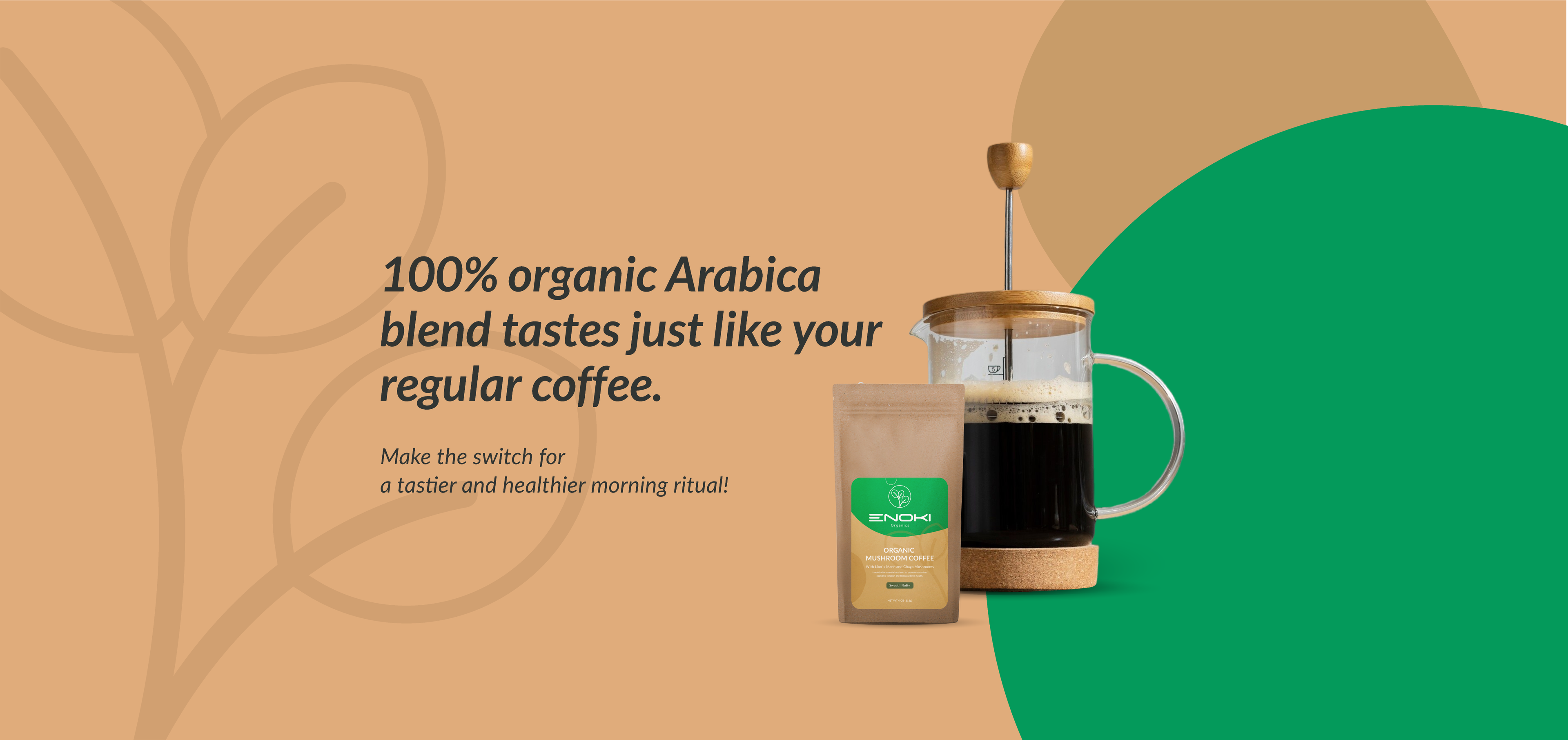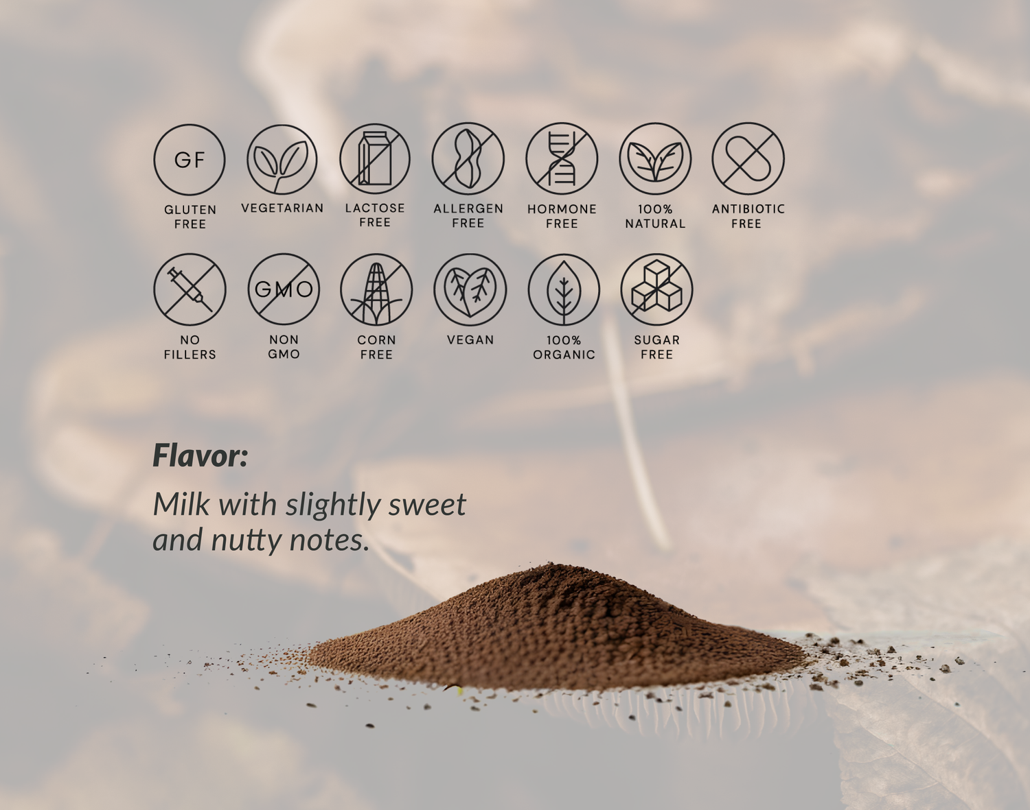 Ingredients: 90% USDA Organic Arabica Coffee, 5% USDA Organic Lion's Mane Mushroom Powder, 5% USDA Organic Chaga Mushroom Powder.
